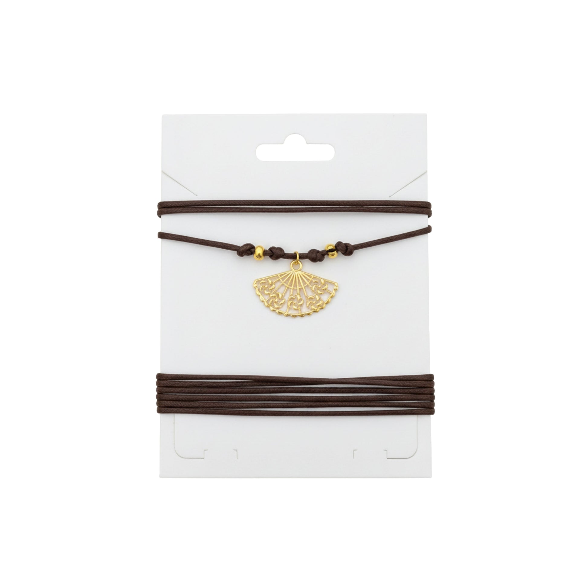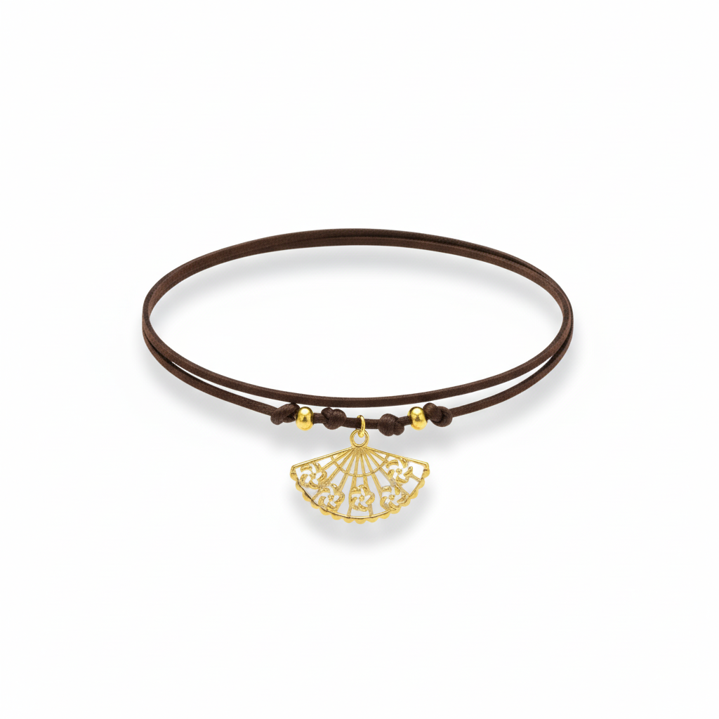 Questo choker artigianale in pelle scamosciata marrone scuro unisce comfort e resistenza con un design sofisticato. Il cordino spesso conferisce robustezza, mentre il charm a ventaglio centrale, finemente dettagliato, dona eleganza e personalità. Le perline dorate ai lati aggiungono un delicato tocco di luce, completando uno stile boho chic raffinato. Un gioiello unico, pensato per chi apprezza l’artigianato e i dettagli distintivi che valorizzano ogni look.