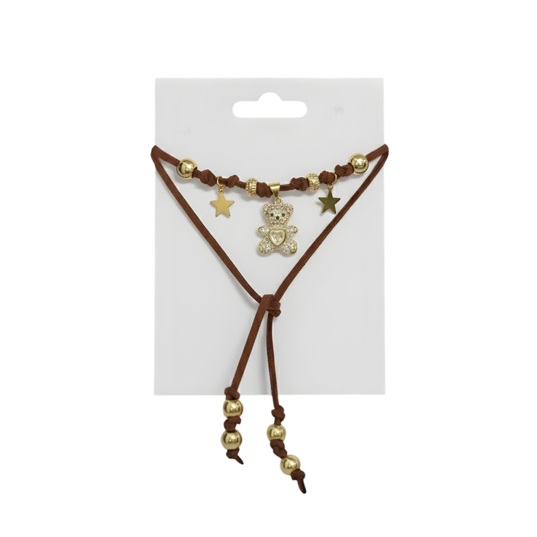 Al centro spicca un dolcissimo orsetto, impreziosito da un cuore in diamante che dona luce e preziosità al design. Ai lati dell’orsetto si alternano distanziatori, piccole stelline e perline, creando un equilibrio armonioso e sofisticato.